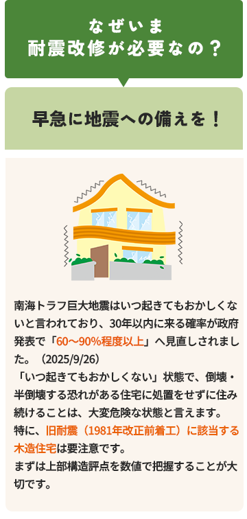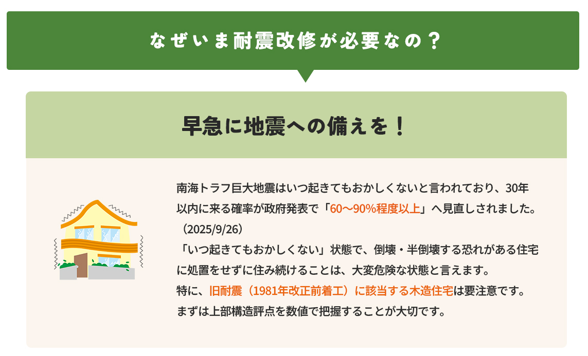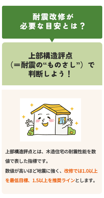 石井町の補助活用の目安: 改修後に評点1.0以上を目標とした計画づくりを行います。まずは無料診断で現在の評点を把握しましょう。